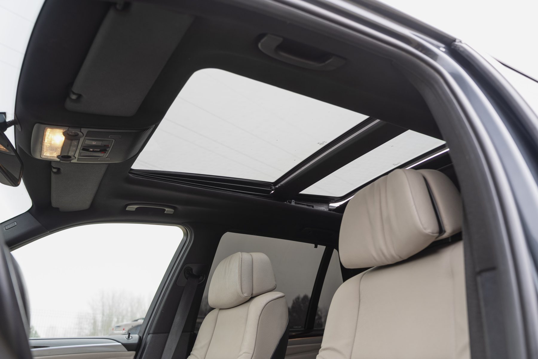 Gaišs ādas komforta tipa salons ar melnajiem griestiem.